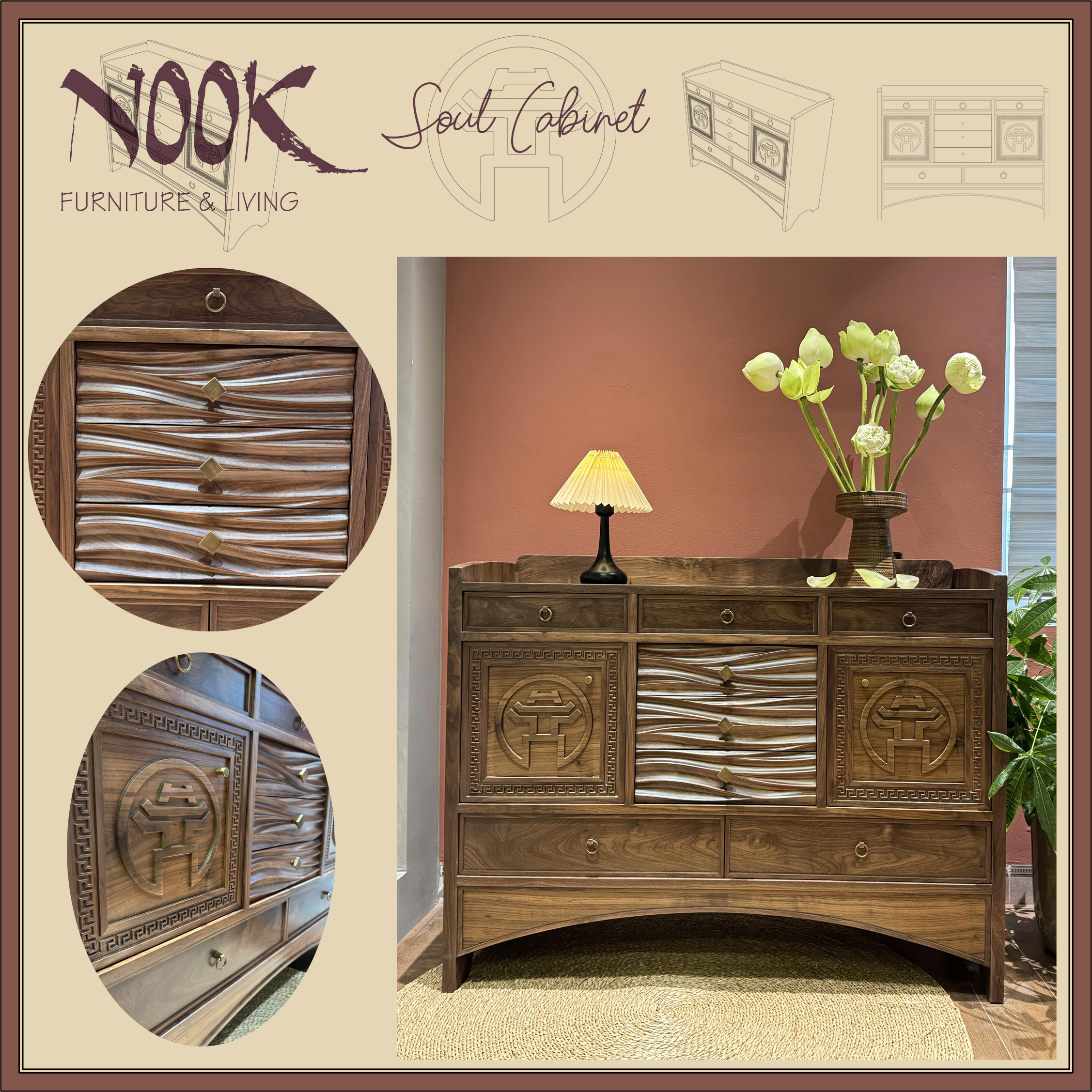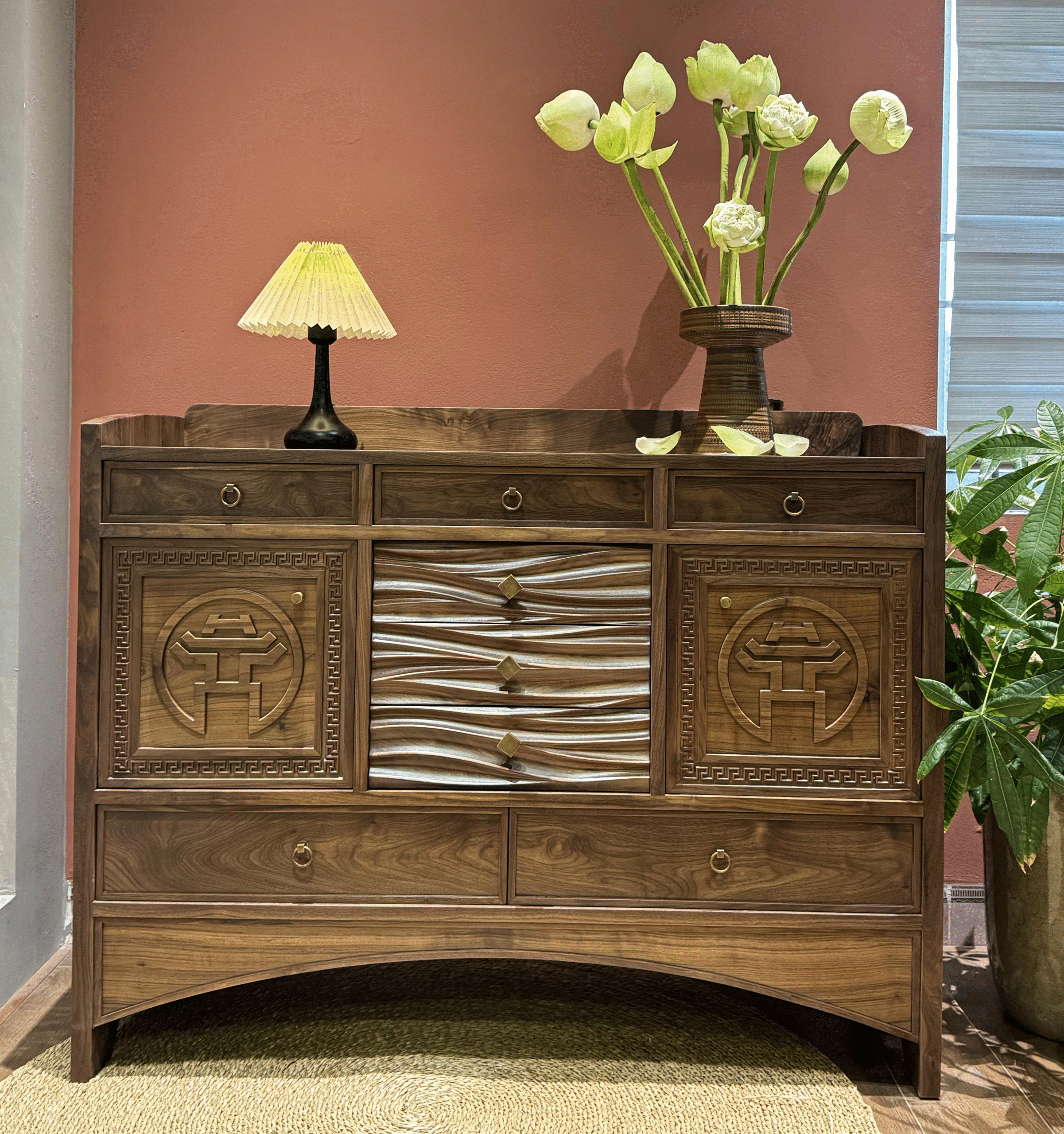 Được chế tác từ gỗ óc chó nguyên khối được tuyển chọn kỹ lưỡng, từng chi tiết chạm khắc đều là minh chứng cho sự chính xác và tâm huyết.